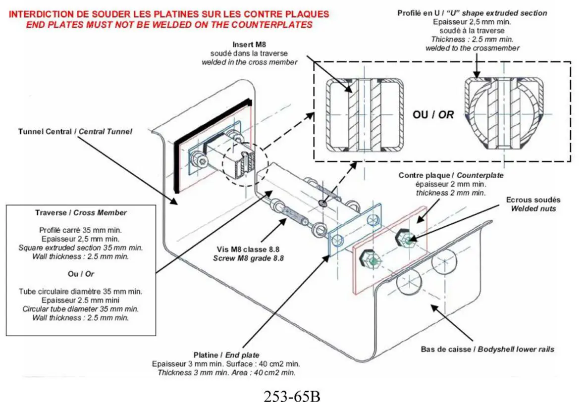 Monteringssats för stolar enligt FIA 253-65B. Innehåller 2 st rör med svetsade insatsgängor, 4st fästplåtar med muttrar samt motsvarande bricka och skruvar och brickor. Rören monteras mellan kardantunnel och tröskellåda. Stolarna monteras sedan med sidomontage i rörens skruvhål. C-C mått mellan skruvhålen 397 mm. Gänga M8.