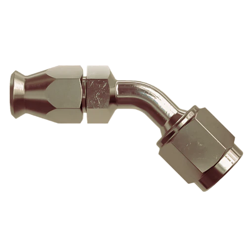 Goodridge serie 600 slangnippel till stålomspunnen teflonslang med gänga hona 3/8″-24 UNF och konkav ände, 45° nippel med svivel. Passande till slang i storlek AN3.