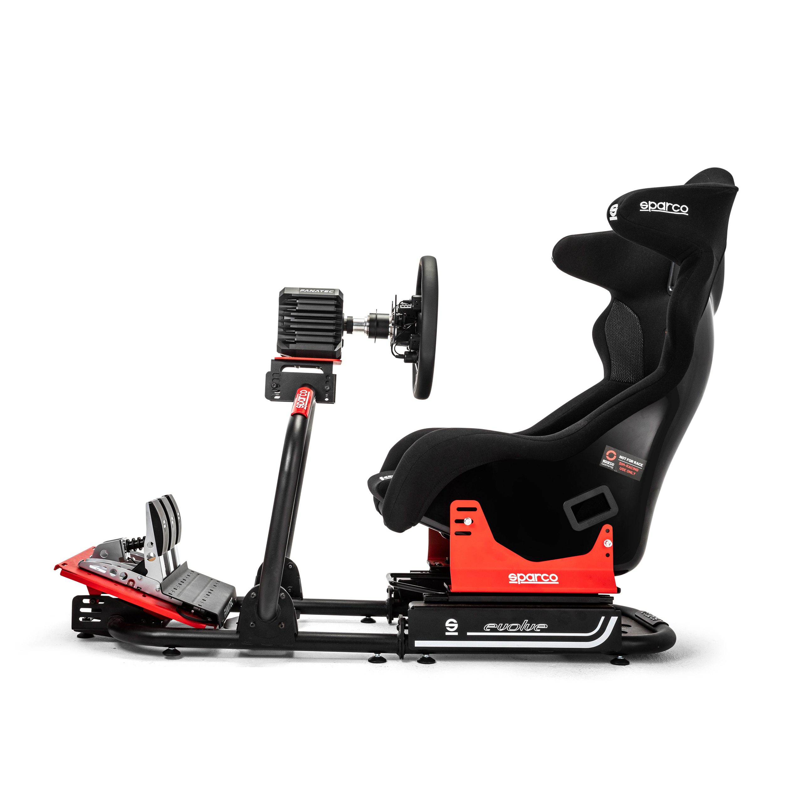 Sparco Evolve GT-R Sim Rig I för virtuell bilsport. Evolve GT-R Playseat kit med Sparco Circuit II gamingstol och ratt och pedaler från Fanatec. Stol och körställning är speciellt lämpad för Rally och GT racing. Evolve-ramen kan justeras på ett antal olika sätt med hjälp av justerbara reglage för ratt och pedalplattor som kan tiltas eller skjutas, stolen kan förflyttas framåt och bakåt med glidskena som gör att man kan ställa in en optimal körställning.