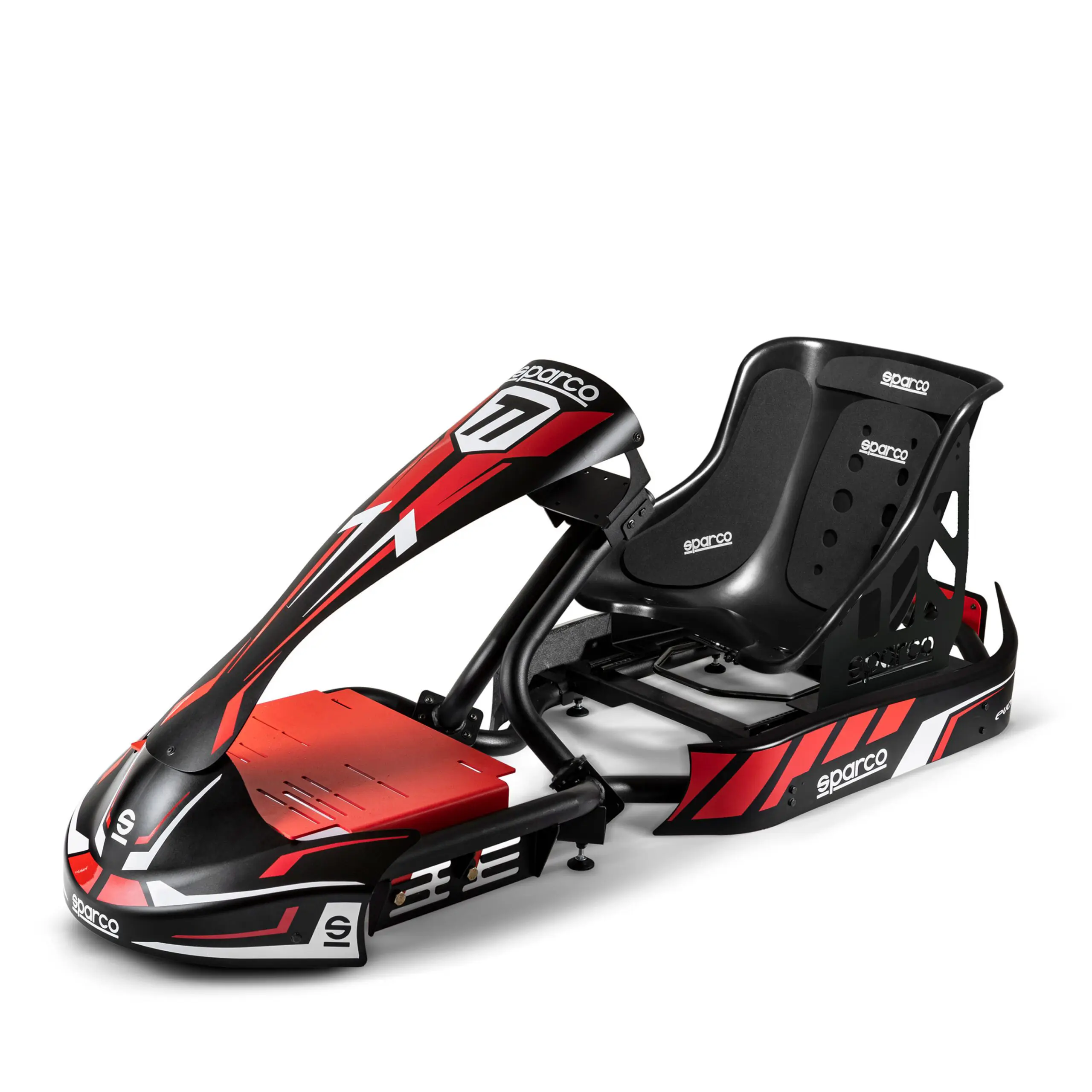 Sparco Evolve Kart PRO racingsimulator för virtuell karting, utvecklad från det chassi som används i kartingmästerskapen. Stolen kan förflyttas framåt och bakåt med glidskena som gör att man kan ställa in en optimal körställning. Evolve Kart Pro består av följande utrustning.