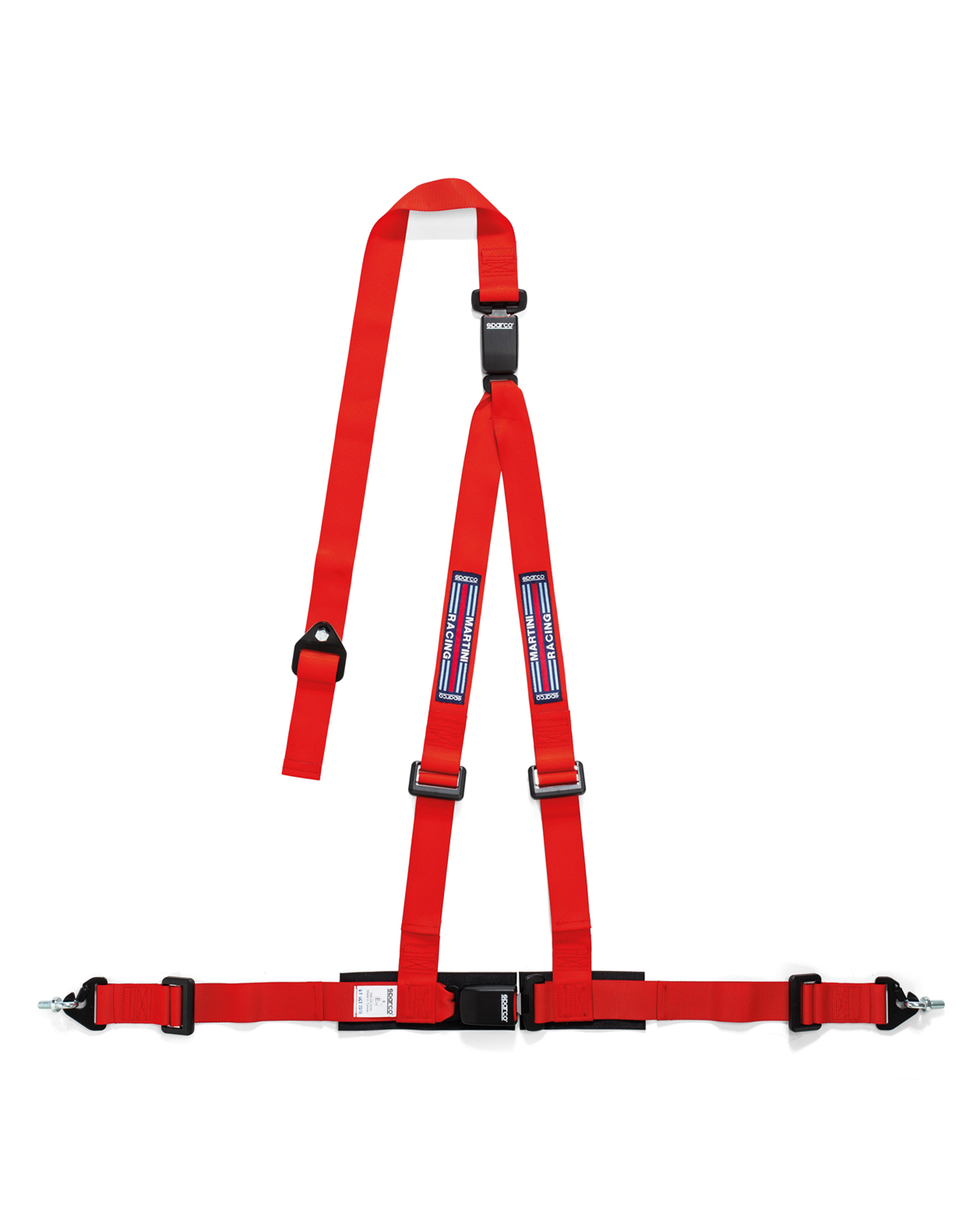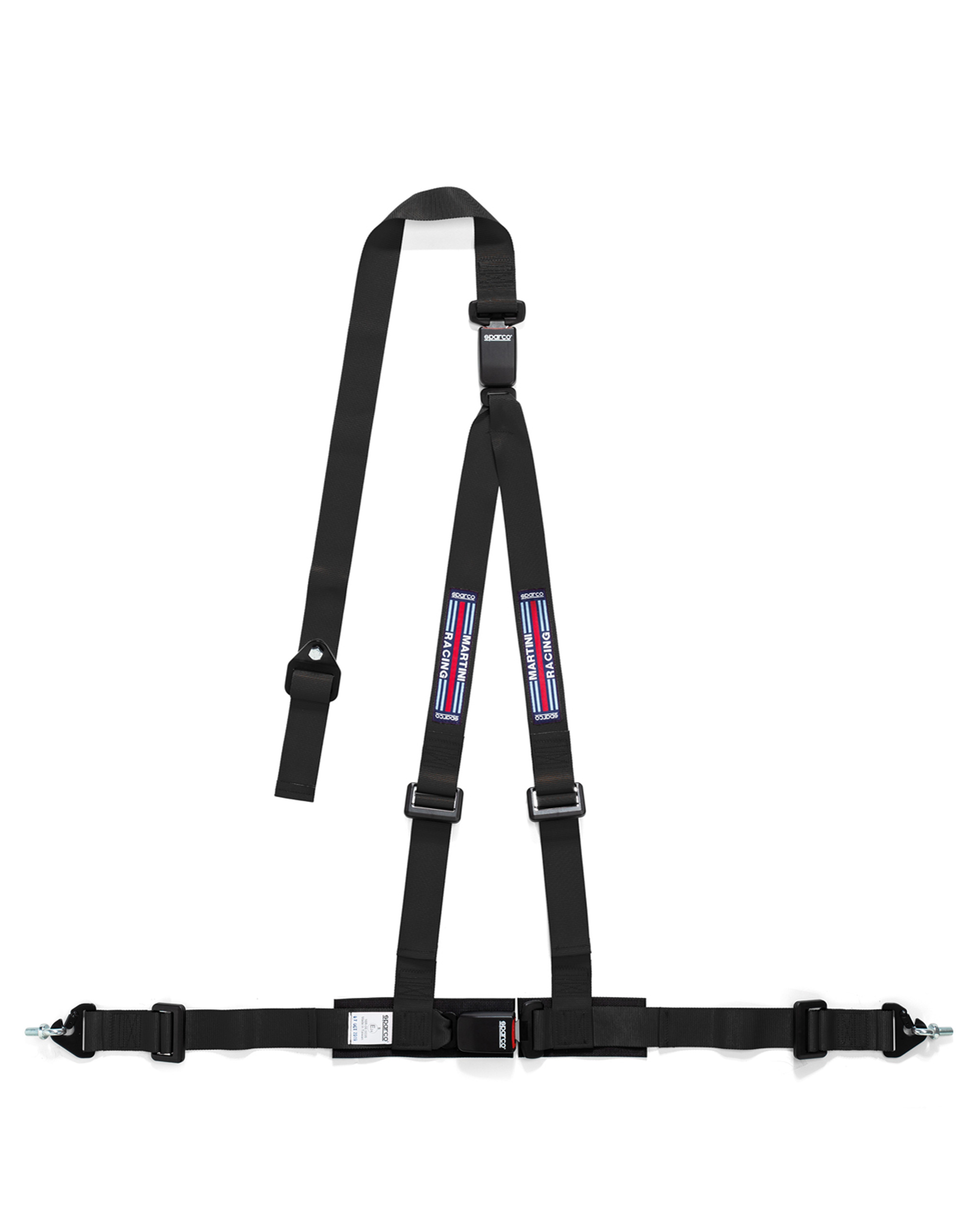 Sparco 3-Punktsbälte med 2″axel och midjeremmar. Martini racing edition med loggor på axelbanden. Snap-On montering. Öglebult ingår. ECE-godkänt.