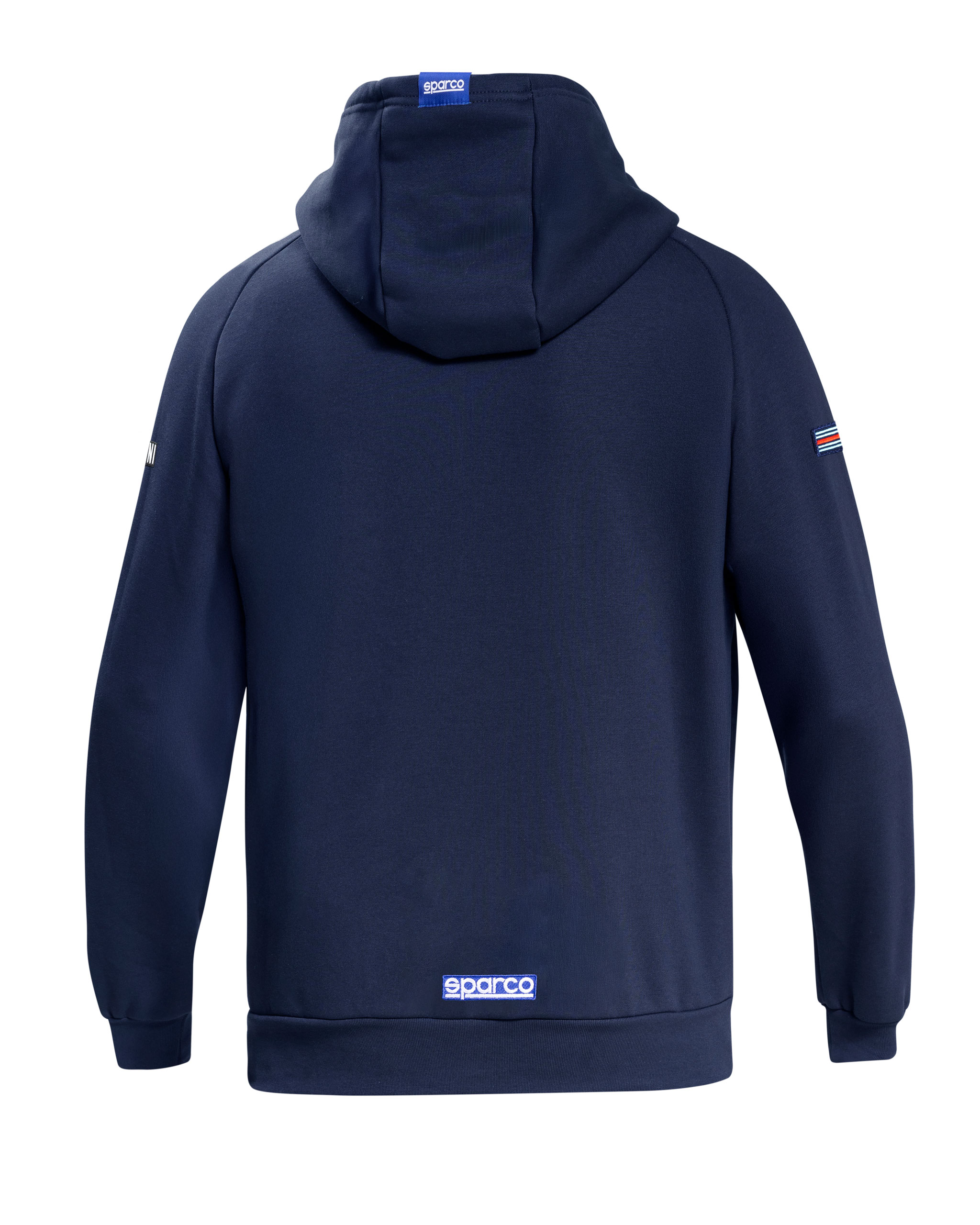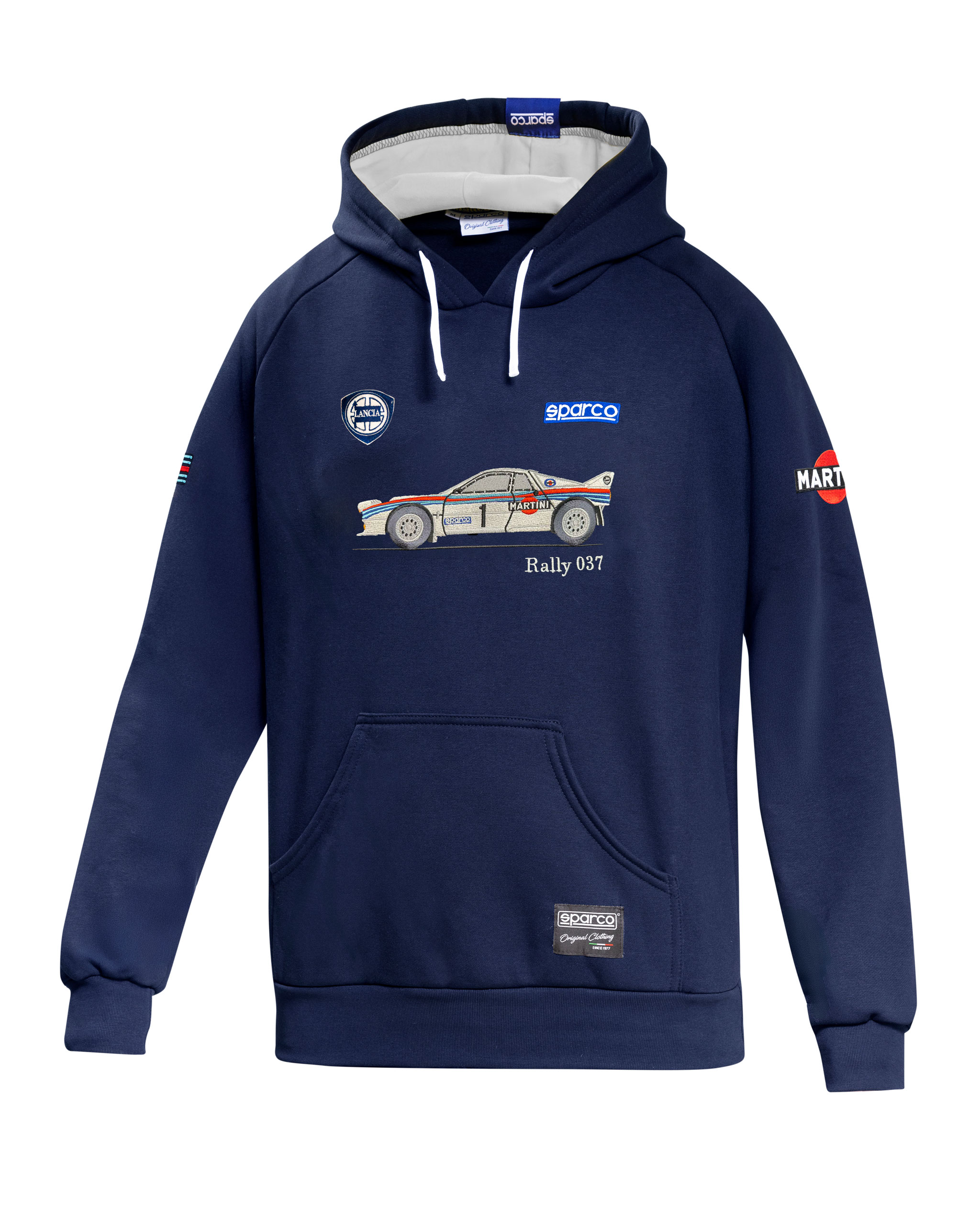 Sparco hoodie 037 Lancia Martini av mjukt borstat tyg av 90% bomull och 10% polyester. Fodrad huva med dragsko och ficka på magen. Stor broderad Lancia 037 logotype på bröstet.