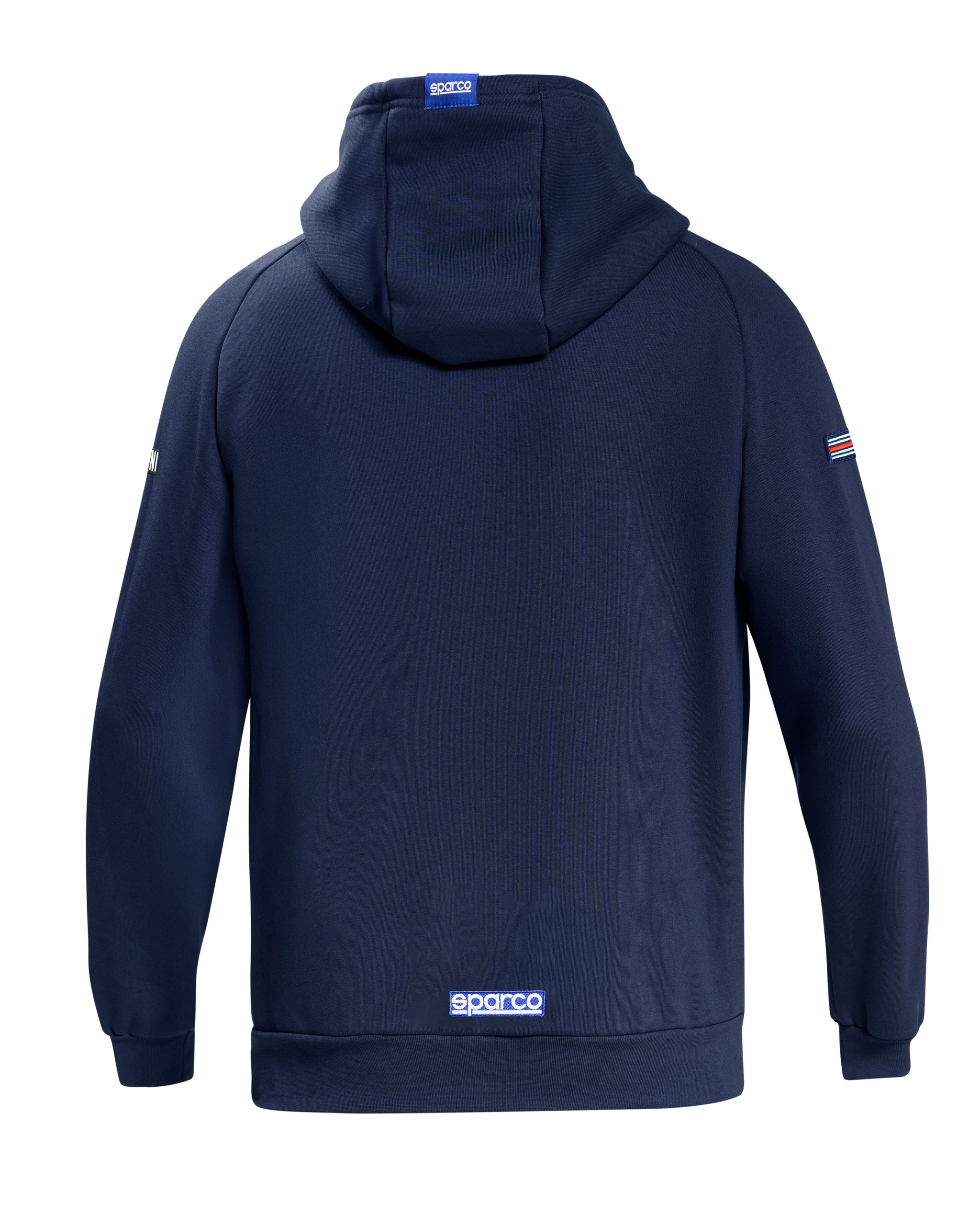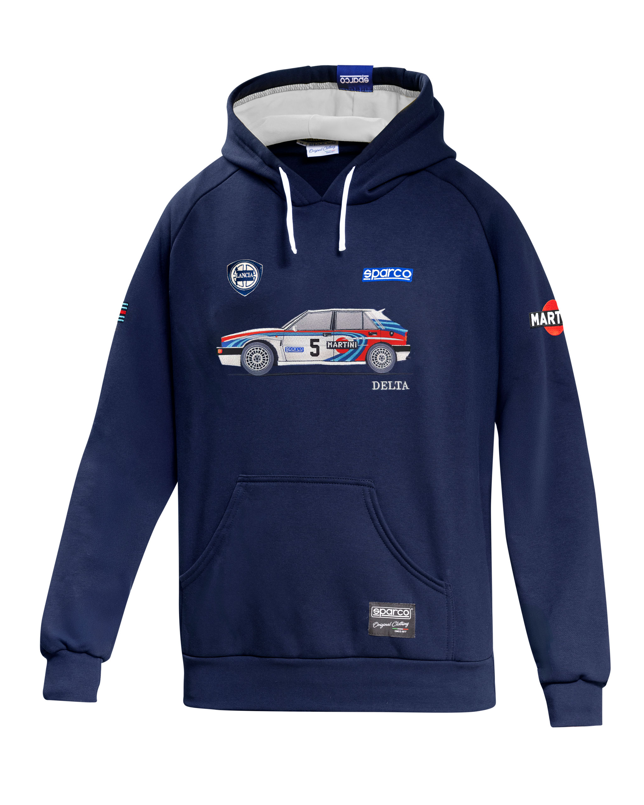 Sparco hoodie Delta HF Lancia Martini av mjukt borstat tyg av 90% bomull och 10% polyester. Fodrad huva med dragsko och ficka på magen. Stor broderad Lancia Delta HF logotype på bröstet.