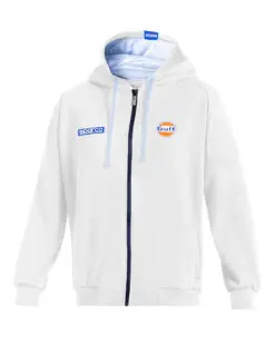 Sparco Hoodie full zip Gulf av mjukt borstat tyg av 90% bomull och 10% polyester. Fodrad huva med dragsko och hel dragkedja fram. Gulf logotyp av TPU.