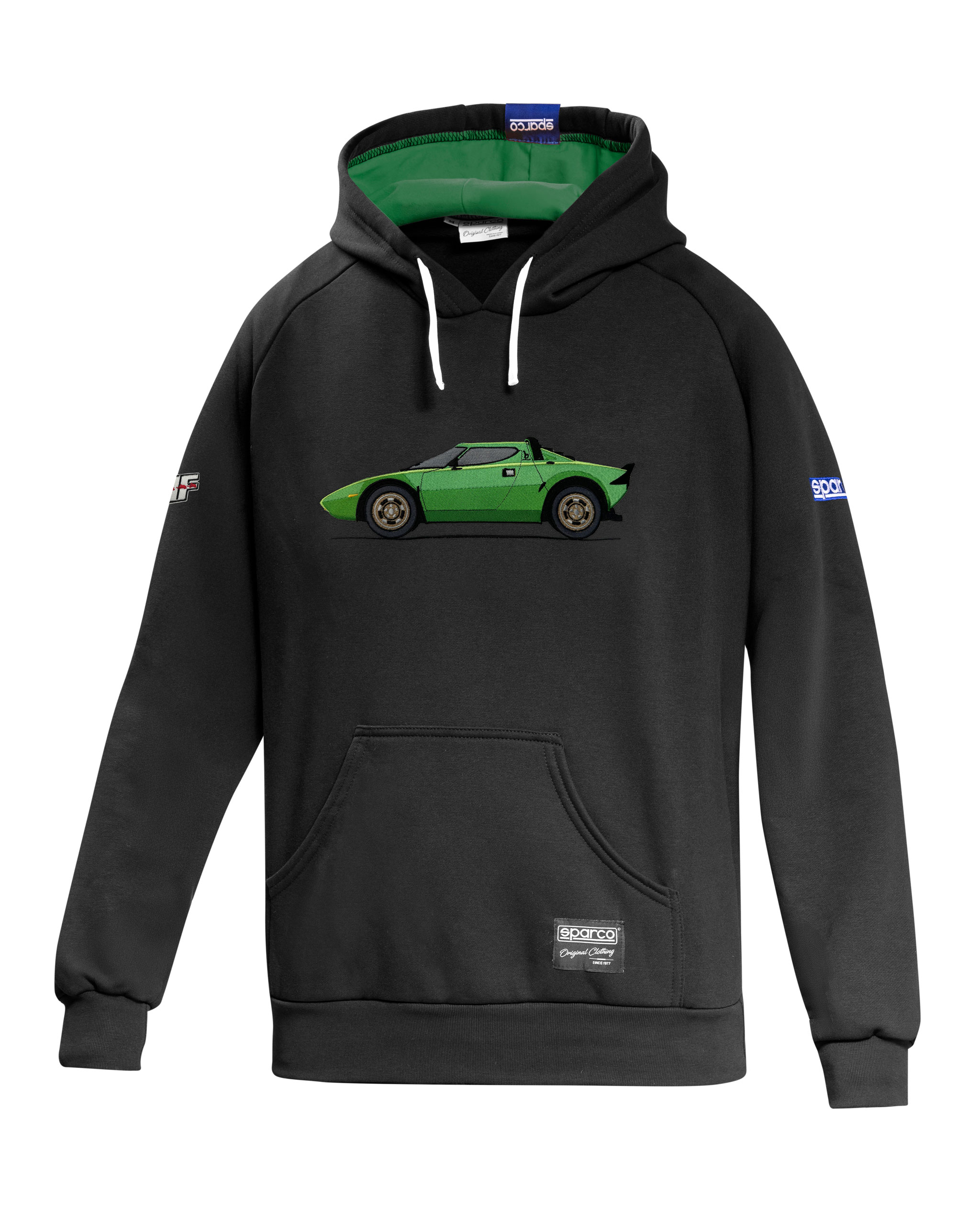 Sparco hoodie Lancia GR.4 av mjukt borstat tyg av 90% bomull och 10% polyester. Fodrad huva med dragsko och ficka på magen. Stor broderad Lancia GR.4 logotype på bröstet.