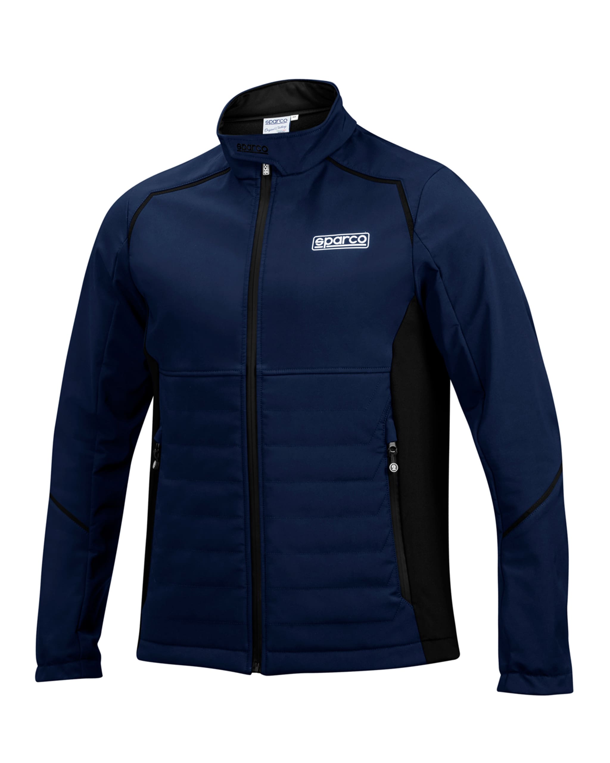 Sparco Softshell jacka, av 100% Polyester. Vattenavvisande och vindtät med fleece foder. Vattentäta dragkedjor. Strechpaneler i sidorna.