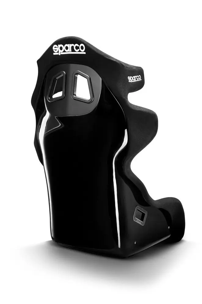Sparco Pro ADV QRT glasfiberstol med huvudskydd. Uttag för 6-punkts bälte. Sidomontage. Hansförberedd. Storlek medium/large. FIA 8855-1999 godkänd.